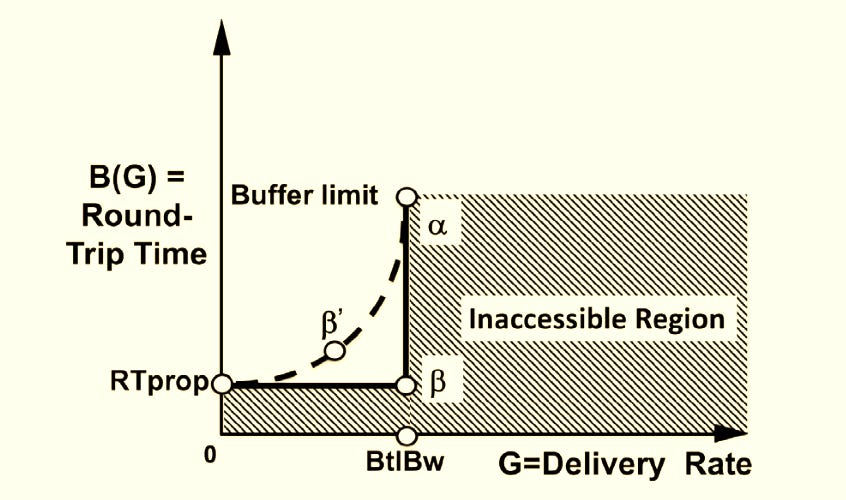 Now coming back to the power diagram, for the deterministic case (when the arrival process and service process are constant), finding the optimal network operating point is easy as we increase G for as long as B(G) does not increase. This converges to β. Any further increase in sending rate will cause queueing and delay in round trip time. Buffer limit (α) is reached when the queues are filled and packet loss occurs beyond this point (recall the earlier stubborn loss-based algorithms operated at this point and completely missed the point!). The shaded region beyond a maximum sending rate (bottleneck bandwidth BtlBw) and below a minimum RTT (RTprop) is inaccessible.