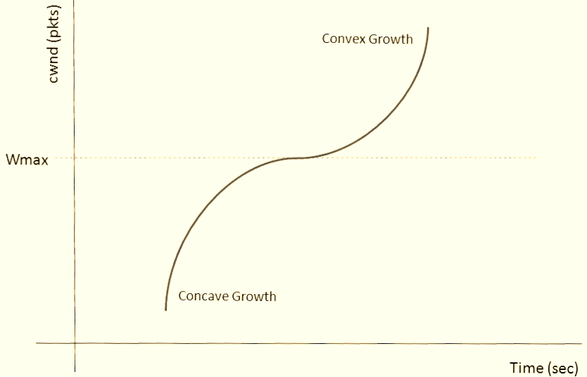 CUBIC replaces linear increase with a cubic function:W(t) = C × (t - K)³ + W_max