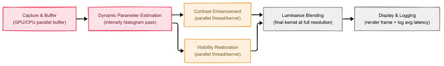 • parallel luminance blending: the critical operations—contrast enhancement and visibility restoration—can run concurrently in separate threads or GPU kernels. Then, a final kernel does the blending step at full image resolution.